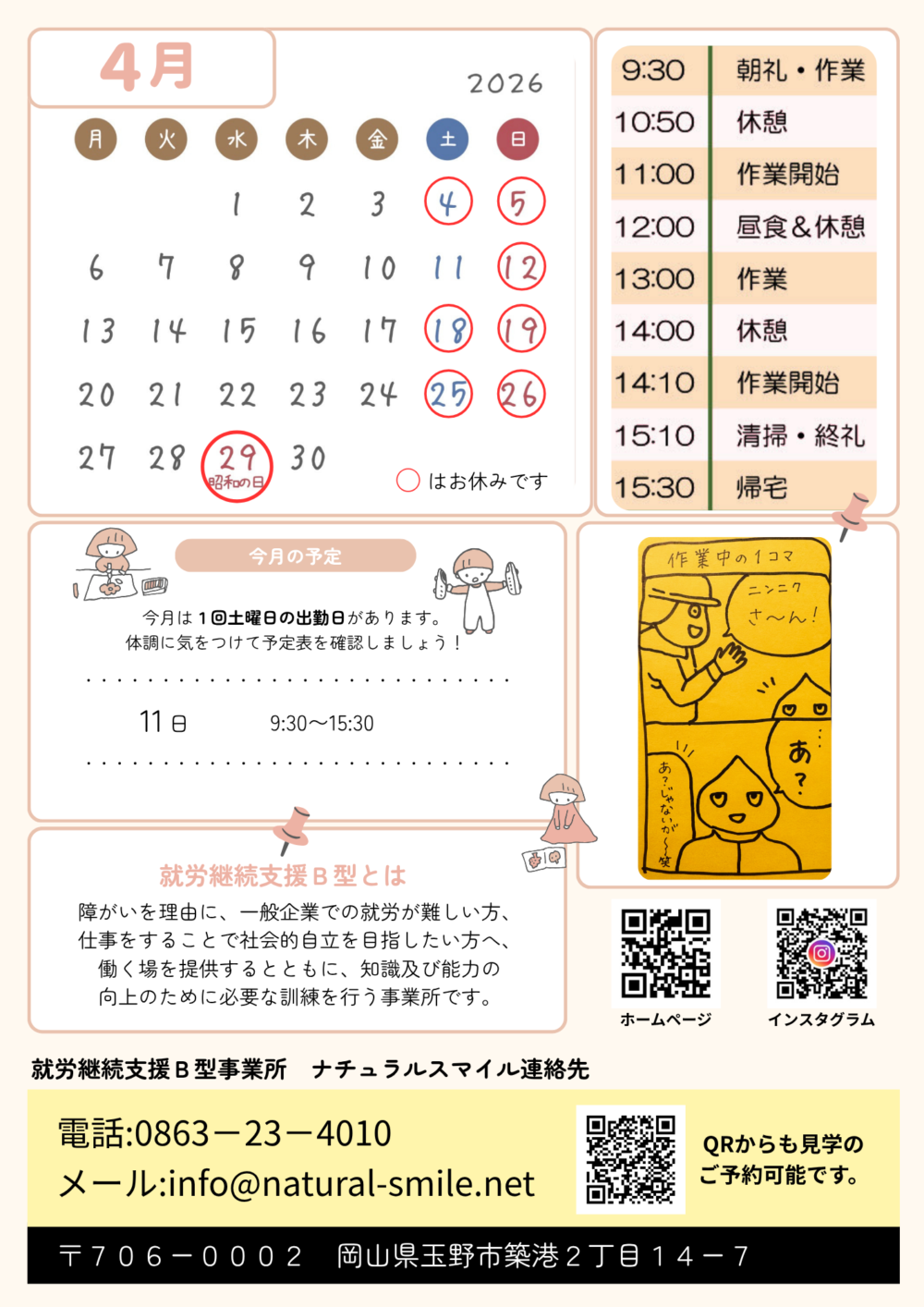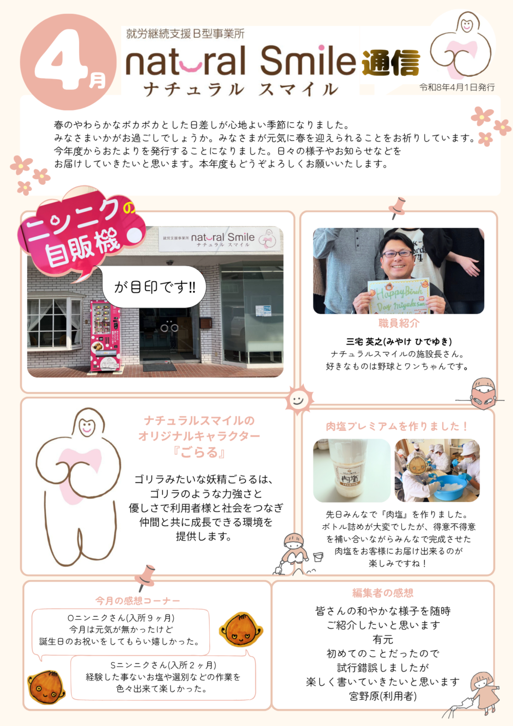 この度、利用者さんの日々の活動の様子や、事業所の取り組みをより身近に感じていただきたいという思いから、広報誌「natural Smile通信」を創刊いたしました。